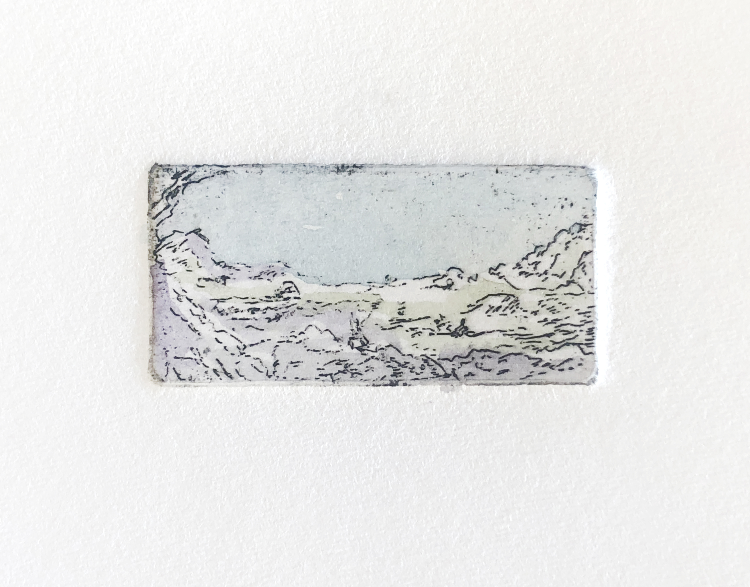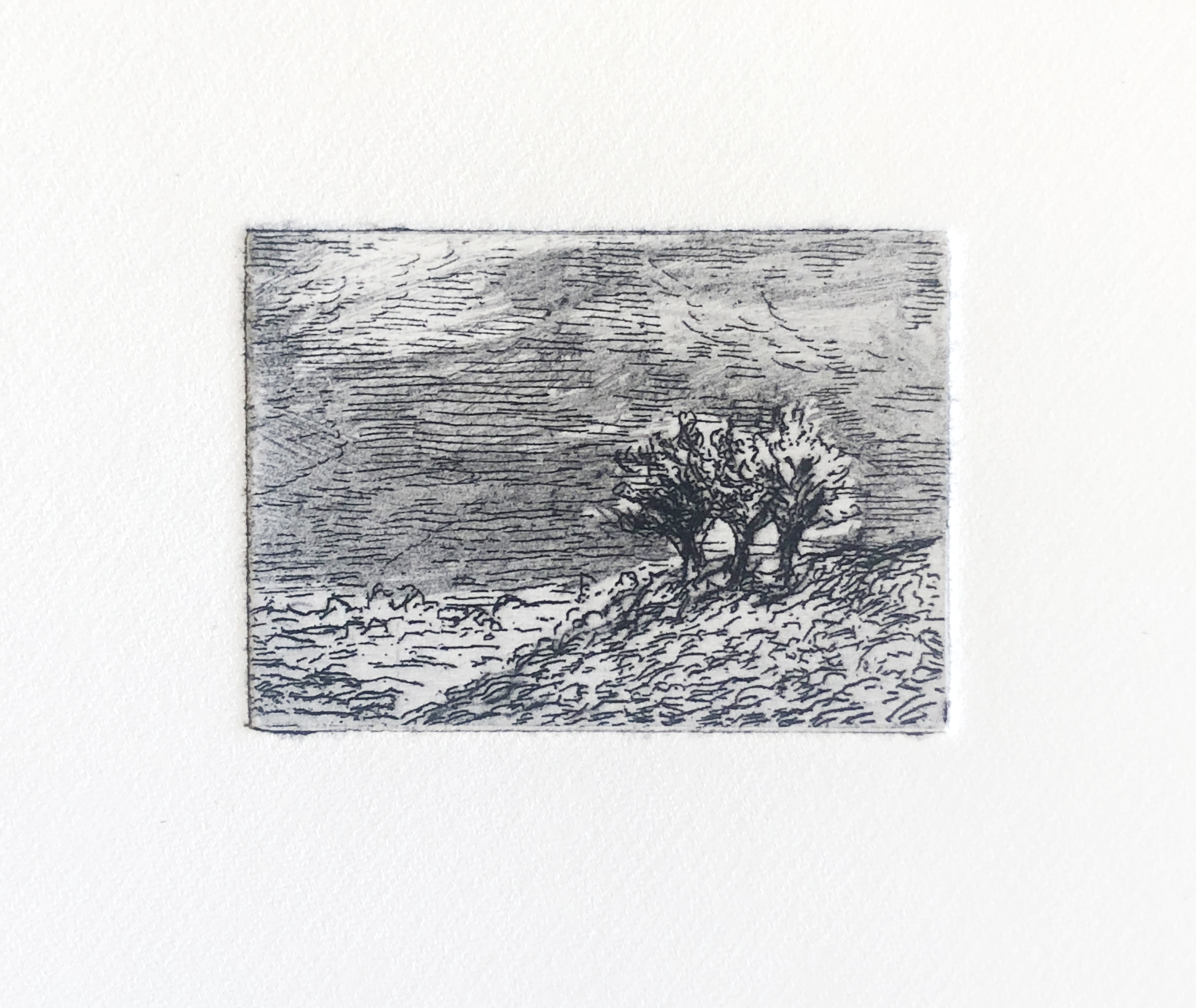 This series of etchings are inspired by the works of Hercules Seghers, Rembrandt and Bruegel the Younger. Some are also loosely inspired by Dutch landscape paintings from the 17th century. The prints are very small, some are roughly the size of a stamp, and are at times watercoloured.